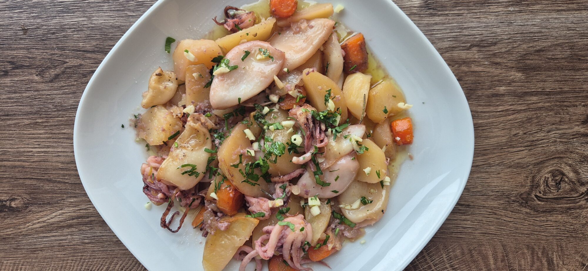 Jelo stavite u zagrijanu pećnicu na 200 stupnjeva i pecite poklopljeno folijom 30-tak minuta da lignje puste svoje sokove i da krumpir omekša.